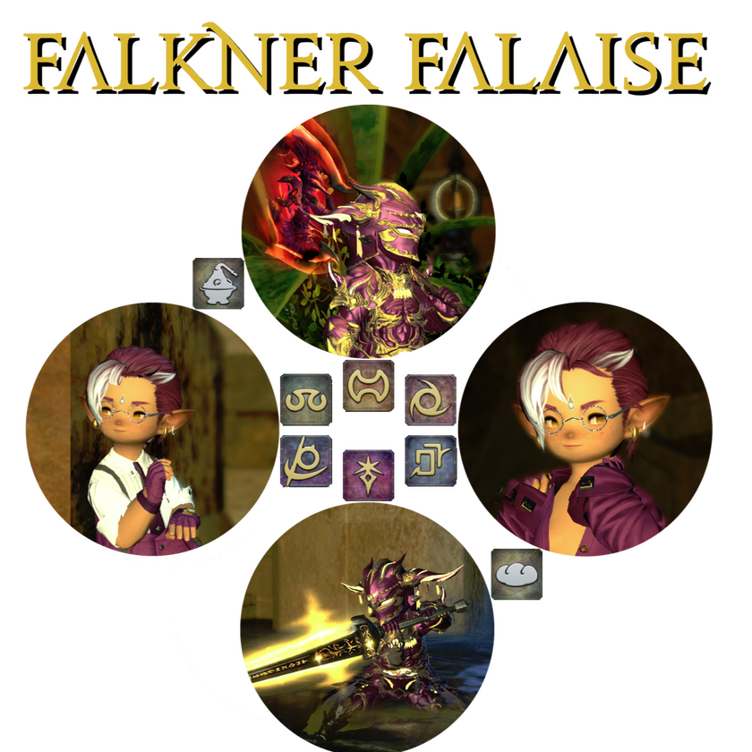 Driven by curiosity as he traveled the world, Falkner began picking up multiple jobs, for the sake of leading dangerous forays into dungeons, keeps, untamed wilds and islands, and even the very frontlines of several wars.Currently he's gotten a firm grasp of healing as an Astrologian and a Scholar, assaulting and assassinating as a Reaper and Ninja, and defending his friends and allies as a Warrior and Dark Knight.While he has learned a few other jobs as well, he wouldn't say he's so confident about them that he'd put others at risk. The kinds of risks he's seen first hand in Ishgard, on tour in Gyr Abania, at the island of Eureka, over the nation of Dalmasca, the region of Norvrandt, and many other troubled lands.Traveling abroad for so long had him seeing many cultures and crafts, inspiring him to learn a little bit of everything in some fashion. Though he certainly specializes in the nourishing of others primarily as an Alchemist and Chef, and as such tends to be the one seeing to the well being of his fellow adventurers both on and off the battlefield.